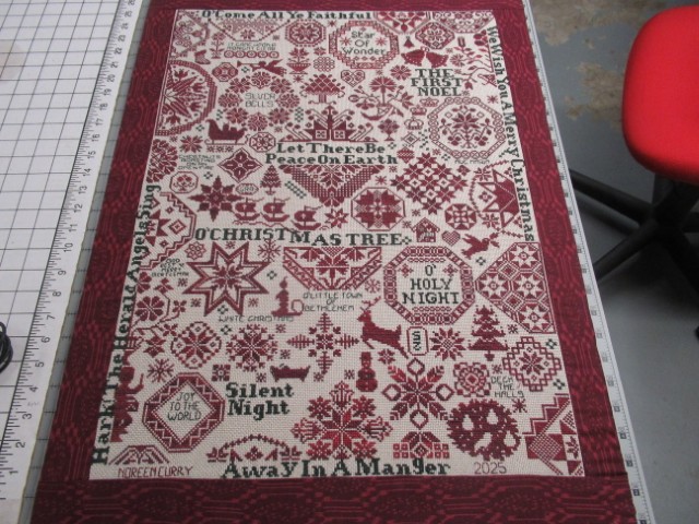 The last time I had a challenge was the year I did the remake of the five foot tall Santa. The velvet fabric with right sides together wanted to slide away from each other. As that time I had ordered a product that was 1/4″ wide and I think they called it Wonder Stitch. It came on a fairly good sized flat roll. By peeling of the protective coating, it became a 1/4″ of almost an invisible product. At that time I put down a strip on the right side of the seam allowance and then carefully put down the right side of the soon to be seam. It worked. I couldn’t get too far ahead of the machine sewing as with no pins working it kept me busy lining up the 3/8ths seam. I still had some of the Wonder Stitch.