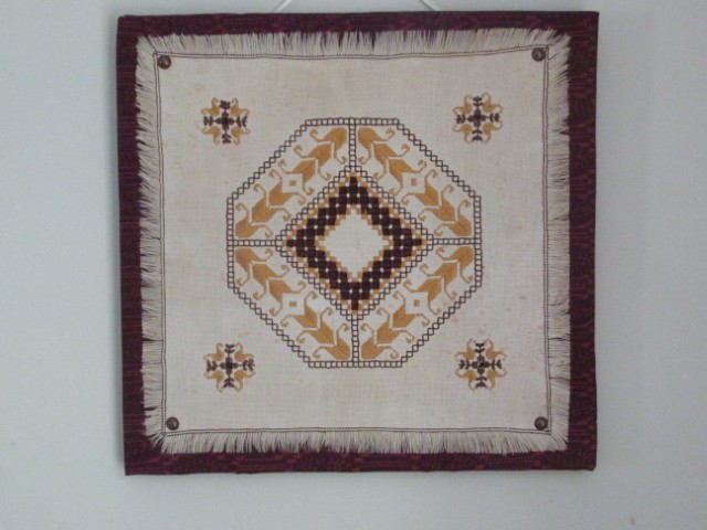 I had a good session in the studio this forenoon.  The piece of hardanger will live a bit longer as I did find a way to display it.  That is one craft I never dipped my toe into but I can appreciate the time and skill in achieving a finished project.  I had everything in the stashes to freshen it up.  I did not resort to any type of glue on the fabric.  Yesterday I did glue two equal squares of foam board together to allow for some sturdiness.  Today, I stretched a burgundy color of the fabric over it so as to have a colored border for the light color of the stitched fabric to be highlighted.  I looked at the frames I had saved in the studio.  One of them had a backing of foam board that was just the right size to put on the back of my project and thus cover up the edges of the burgundy fabric.  Out of site, out of mind.