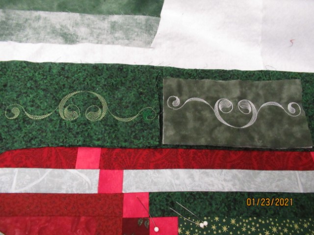 The white thread sample was to just get a feel of the design. The second, on the correct scrap of material that matches the border, took a stop and a start. I began with thread that matched the fabric too closely . . . back to the thread box. I am also still deciding which way to have the design facing as it stitches on the border. Possibilities!